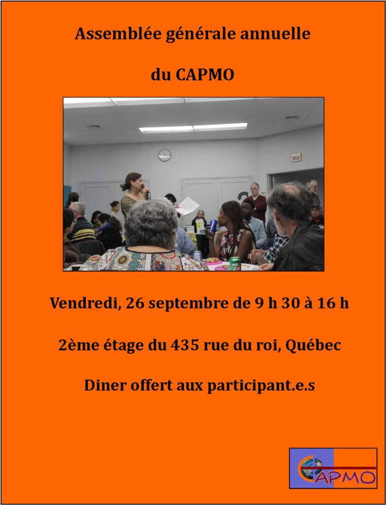 Exceptionnellement, cette année, notre assemblée générale aura lieu un vendredi en raison de la grande manifestation pour la justice sociale et climatique qui aura lieu le lendemain à Québec.