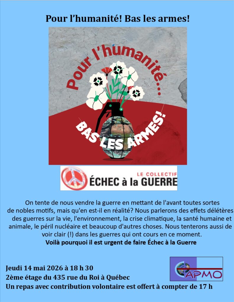 Nous parlerons des effets délétères des guerres sur la vie évidemment, mais aussi sur l’environnement, la crise climatique, la santé humaine et animale, le péril nucléaire et beaucoup d’autres choses. Nous tenterons aussi de voir clair (!) dans les guerres qui ont cours en ce moment. Voilà pourquoi il est urgent de faire Échec à la Guerre!
