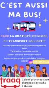 Tout a commencé en 2012, quand le Carrefour d’animation et de participation pour un monde ouvert a mis sur pied un comité citoyen pour dénoncer l’inaccessibilité du transport en commun à Québec. De cette mobilisation est né, en 2016, le Collectif pour un Transport abordable et accessible à Québec (TRAAQ), un regroupement d’organismes et de citoyen·nes déterminé·es à défendre le droit à la mobilité pour les personnes à faible revenu.