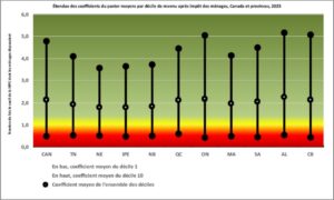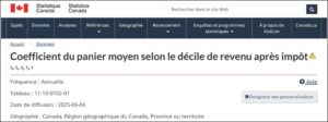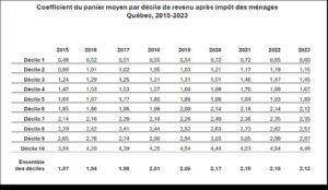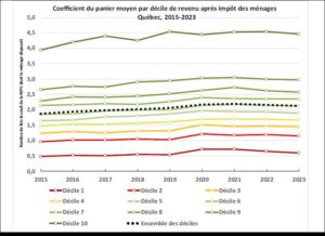 Statistique Canada, 2025. Coefficient du panier moyen selon le décile de revenu après impôt. Tableau : 11-10-0102-01. Voir https://www150.statcan.gc.ca/t1/tbl1/fr/tv.action?pid=1110010201