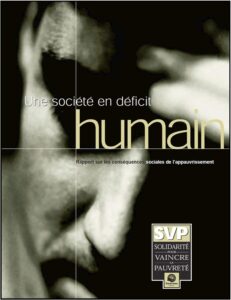 À la même époque, il y a Centraide Québec qui a produit un rapport social intitulé : « Une société en déficit humain ». Comme il était beaucoup question dans les médias du déficit dans les dépenses publiques, mais le déficit humain c’était quand on n’avait pas les moyens de subvenir à ses besoins fondamentaux et qu’on empruntait sur son espérance de vie, on se retrouvait en déficit humain. Quand l’argent rentre et qu’on prend dans notre vie, c’est un peu comme si la société empruntait sur notre corps. Est-ce que cela fait du sens ?