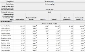 Composantes agrégées et moyennes du revenu après impôt en fonction du seuil de la mesure du panier de consommation, selon le décile de revenu après impôt. Tableau : 11-10-0103-01. Voir https://www150.statcan.gc.ca/t1/tbl1/fr/tv.action?pid=1110010301