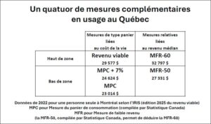 Les deux autres mesures fonctionnaient différemment. D’abord, il y a le revenu médian, qui est au Québec ou au Canada. Puis, si nos revenus sont inférieurs à la moitié de ce nombre, on se trouve sous la Mesure de faible revenu, la MFR-50, un autre indice s’appelle la MFR-60. Celui-ci se calcule à 60% du revenu médian au lieu de la moitié. Alors, la MFR-60 fixe plus haut le seuil de faible revenu et cela donnait que le Revenu viable se situait plus près de celle-ci tandis que la MPC est plus proche de la MFR-50. C’est pour cela que nous avons maintenant quatre indicateurs, mais la mesure de base, pour le gouvernement canadien demeure la MPC.