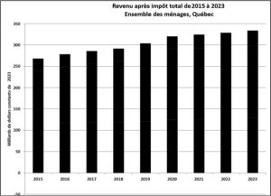 Pour le Québec, le revenu global après impôt est de 334 milliards. Ce qu’il manque, c’est 4.7 milliards pour que tout le monde ait un panier, ce n’est pas 2% de 334 milliards. Ce n’est pas une si grosse tâche que cela. Voici la nouveauté de ce que nous amenons et un grand cadeau du Carrefour de savoir sur les finances publiques, d’habitude quand on regarde le revenu total après impôt pour prendre des décisions budgétaires, cela ressemble à ça. (voir tableau page suivante) C’est passer de 264 milliards à 334 milliards, de 2015 à 2023. Ici, on ne voit pas le déficit, ni à quoi sert l’argent.